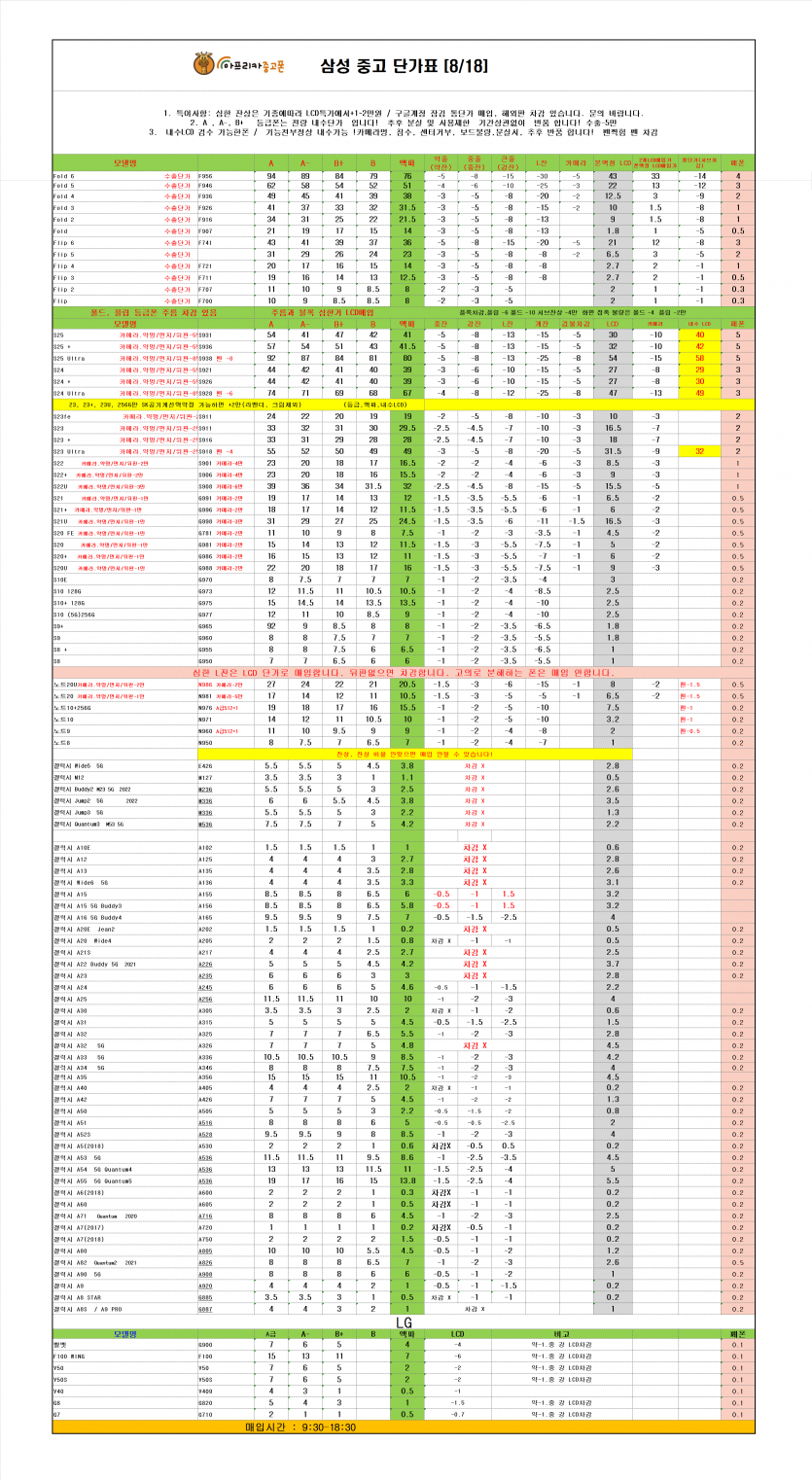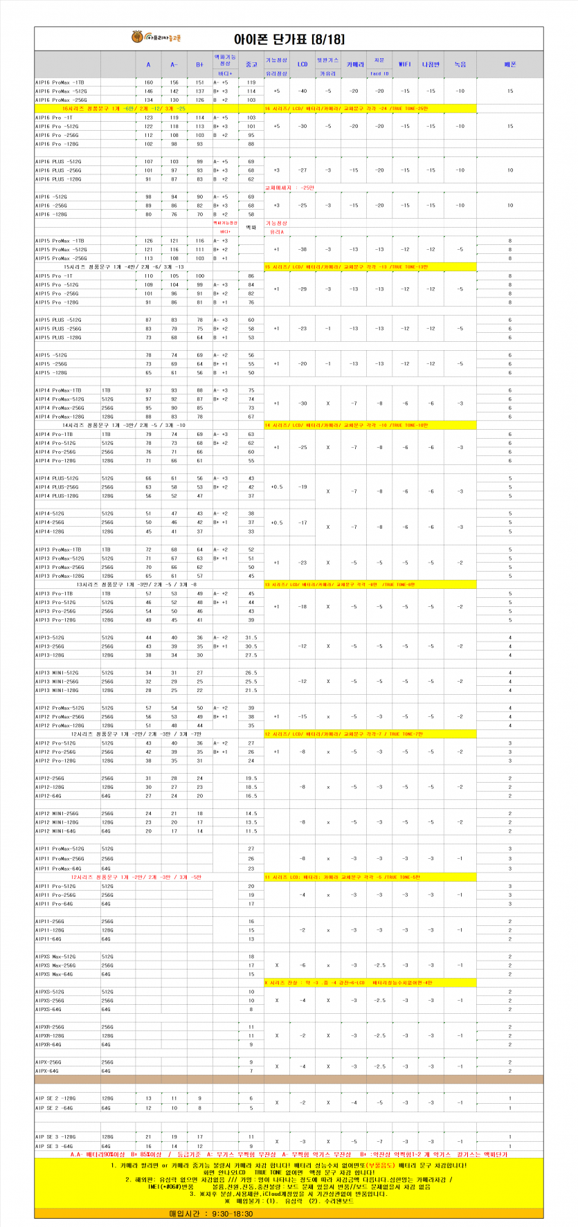 매장소식 2025년 8월 18일 중고폰 매입 단가표 작성일25.08.18 11:45 | 조회수 1,169 2025년 8월 18일 중고폰 매입 단가표 이전글폰사자쇼핑몰 교환&환불 정책 안내 다음글2025년 8월 11일 중고폰 매입 단가표 목록
