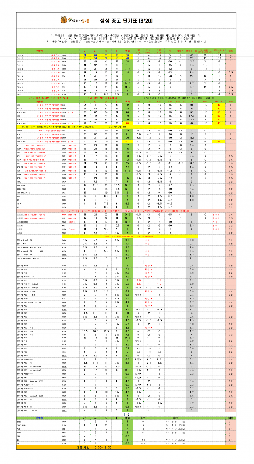 매장소식 2025년 8월 26일 중고폰 매입 단가표 작성일25.08.26 17:58 | 조회수 2,380 2025년 8월 26일 중고폰 매입 단가표 이전글2025년 9월 카드사 무이자 할부 혜택 다음글2025년 8월 22일 중고폰 매입 단가표 목록