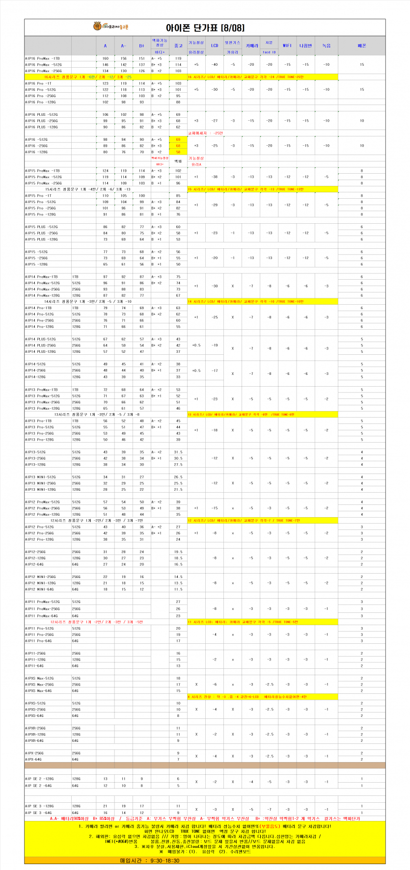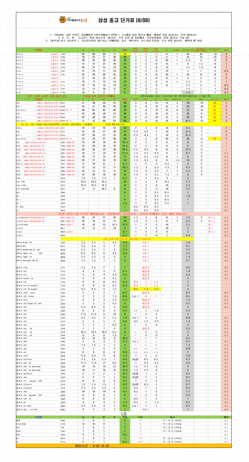 매장소식 2025년 8월 8일 중고폰 매입 단가표 작성일25.08.08 10:37 | 조회수 2,896 2025년 8월 8일 중고폰 매입 단가표 이전글2025년 8월 11일 중고폰 매입 단가표 다음글2025년 8월 카드사 무이자 할부 혜택 안내 목록