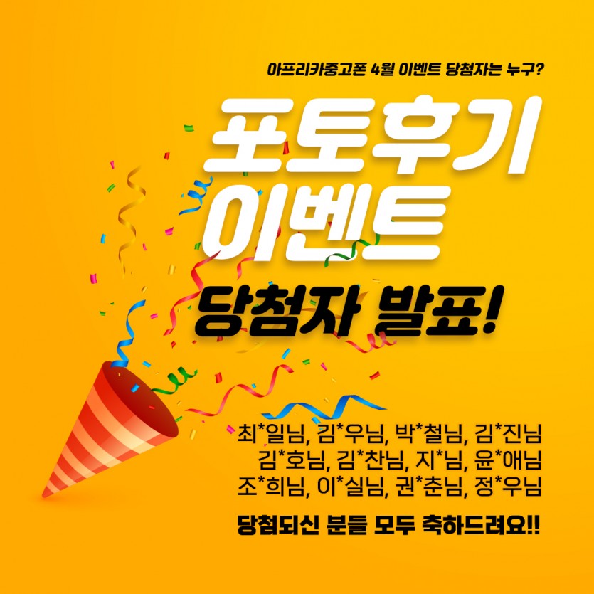 폰사자소식 4월 포토후기 당첨자 안내 작성일23.07.10 15:08 | 조회수 1,894 4월 당첨자 안내입니다.최*일님, 김*우님, 박*철님, 김*진님김*호님, 김*찬님, 지*님, 윤*애님조*희님, 이*실님, 권*춘님, 정*우님포토후기 이벤트에 참여해주신 모든 분께 감사드리며, 선정되신 분께는 순차적으로 모바일 상품권이 발송됩니다. 이전글5월 포토후기 당첨자 안내 다음글[오픈안내] 잠실지사가 새롭게 오픈했습니다. 목록